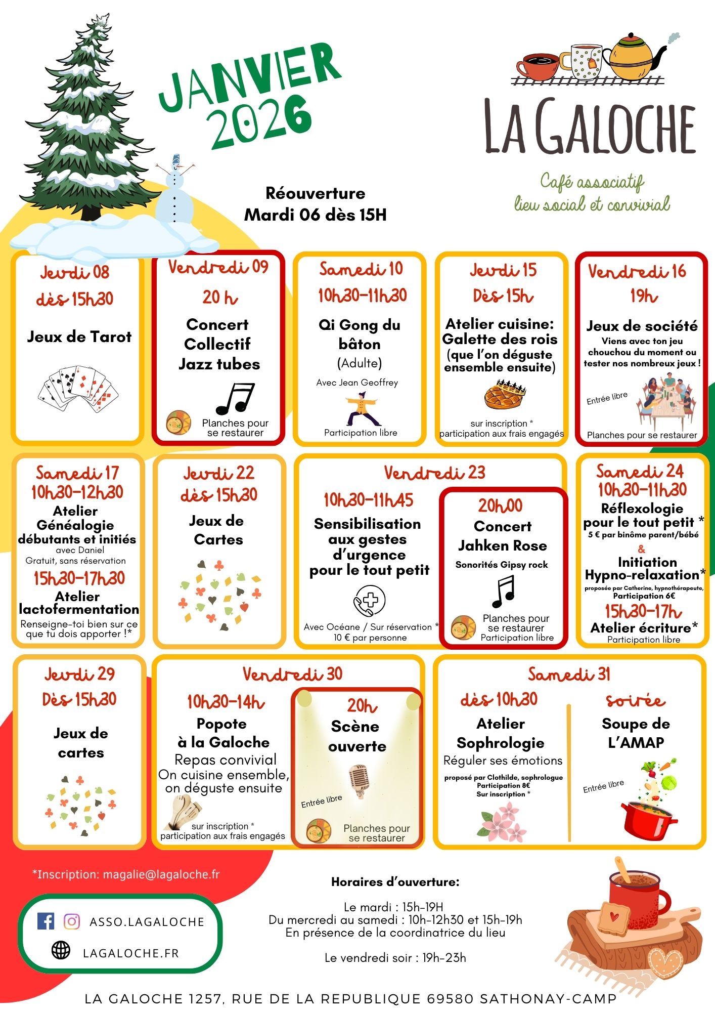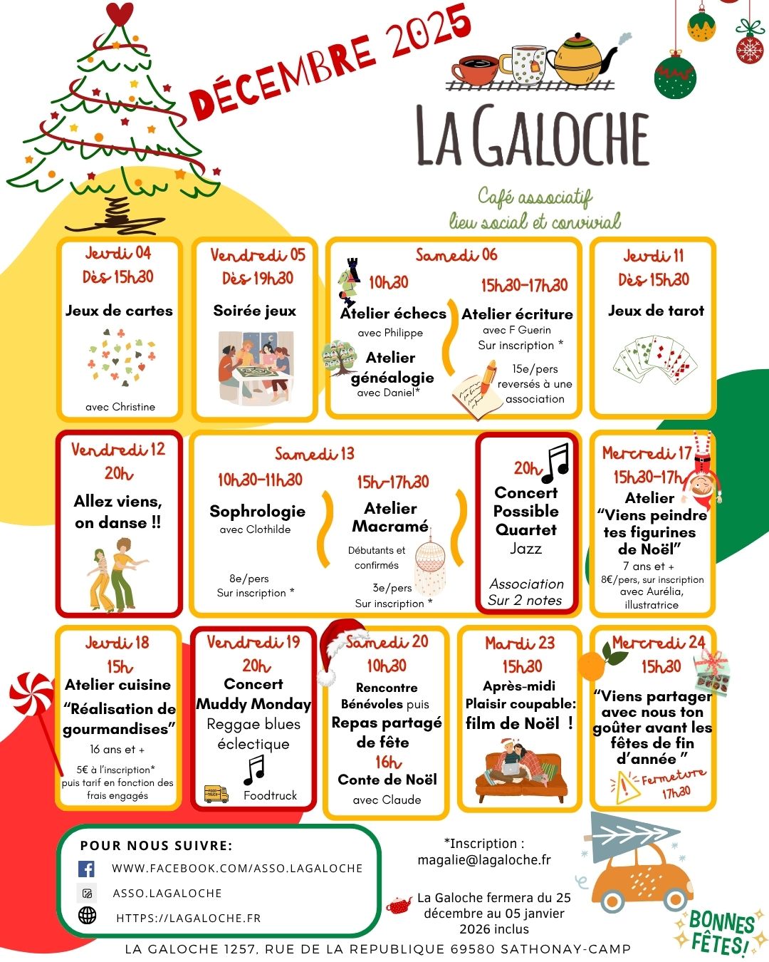 Le collectif La Galoche est né de l’envie d’ouvrir un café associatif, lieu convivial et chaleureux sur Sathonay–Camp. Il a été créé par des habitant.es de Sathonay-Camp désirant un lieu de rencontre animé, ouvert à toutes et tous pour faire émerger des initiatives locales : concerts, conférences, théâtre, débats et échanges de savoirs. Le projet a grandi pour devenir aujourd’hui un lieu-ressource convivial, décontracté et citoyen réunissant à la fois un espace de travail partagé, une épicerie, un café associatif avec une programmation culturelle et festive.
